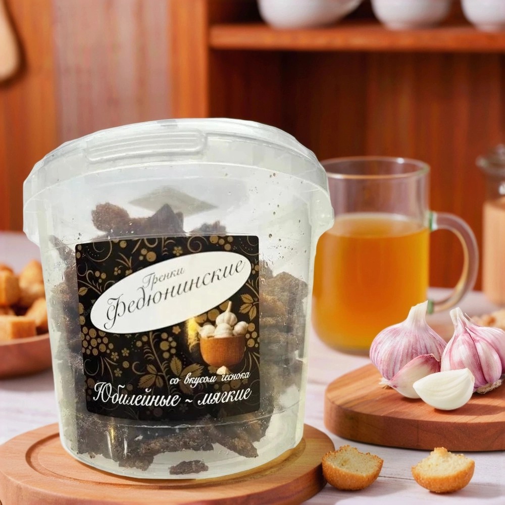 Упакованы гренки в большие пластиковые ведра по 900 г — такой объем удобно брать на компанию и надолго хватает. Натуральный состав и яркий чесночный вкус с элементами русской традиционной кухни делают эти гренки идеальной закуской для любителей насыщенных и аутентичных вкусов.