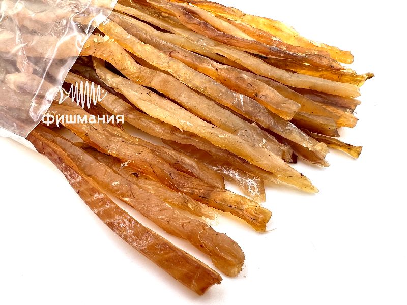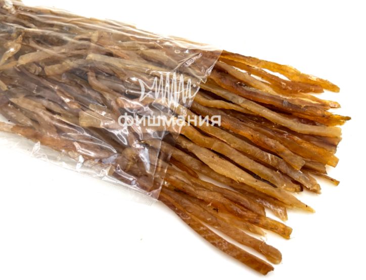 Вяленая рыба произведена из сома и нарезана на тонкие соломки - удобный формат готовой закуски.